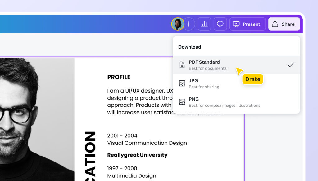 Dizaynı sonda PDF formatında saxla və fayl adı səliqəli olsun: Ad_Soyad_CV.pdf.